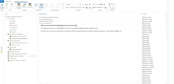 A text module consists of a text field that can be filled with the variables shown on the right. Simply drag and drop them into the respective position. In global text modules, you can use "Use text module for help desk" to determine whether it is also available in tickets.