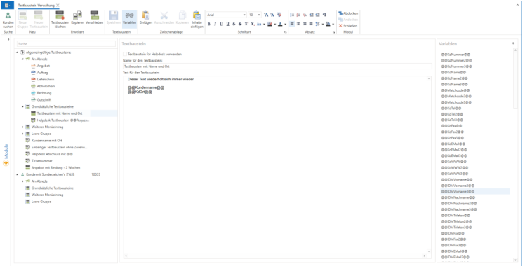 In the "Text Module Management" module, customer-specific and general texts can be created that are used repeatedly in attachments and tickets.