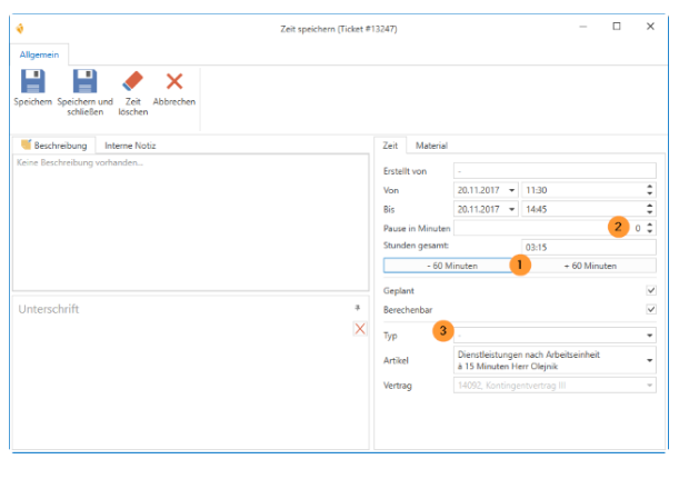 1.The duration of the time to be recorded can now be entered using the Add time or Stopwatch buttons. Adding a stopwatch adds the exact time stopped, e.g., 9:16 a.m. to 10:14 a.m. When adding time manually, the start and end dates can be selected.