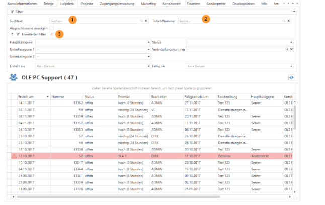You can further narrow down your search results using the search text (1), the ticket number (2), and the advanced filters (3).