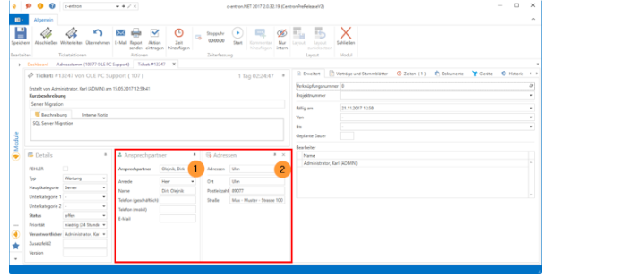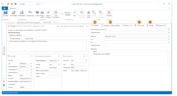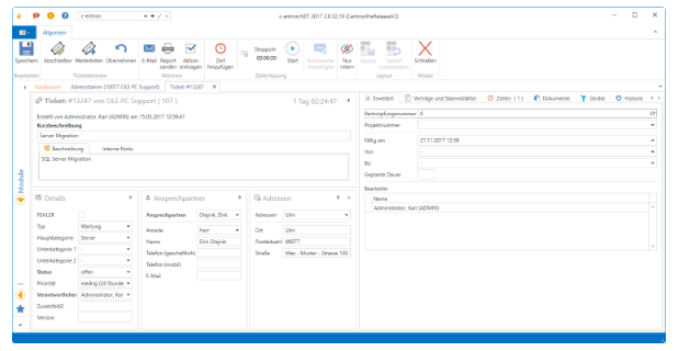 This ticket window contains general information such as ticket number, due date, brief description, detailed description, link number, ticket details, contact person, and address.