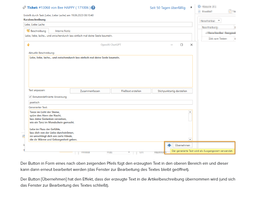 Ticket description with "AI" option