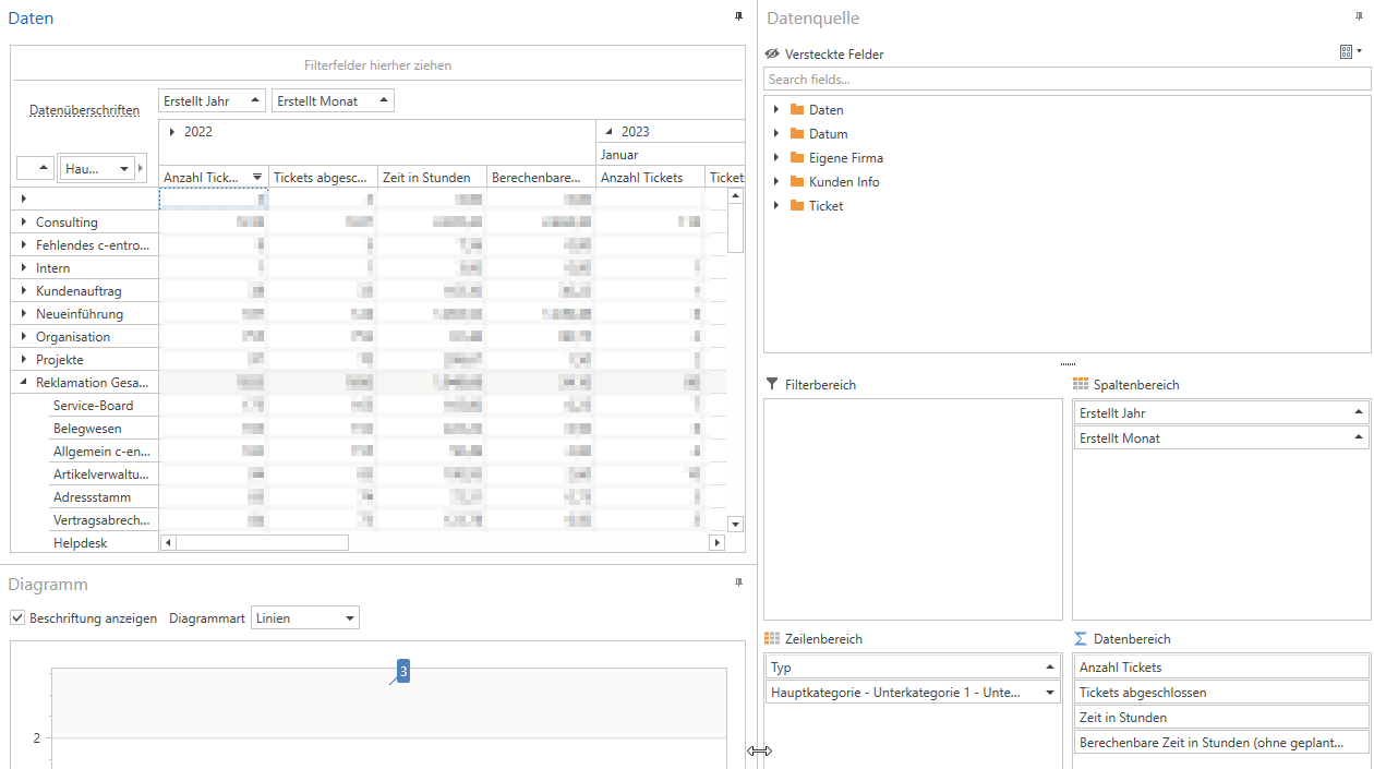 If ticket evaluation by category/type is required, this allows you to analyze how many tickets were created for this purpose and how much time was ultimately recorded. It also shows how many of these tickets were closed.