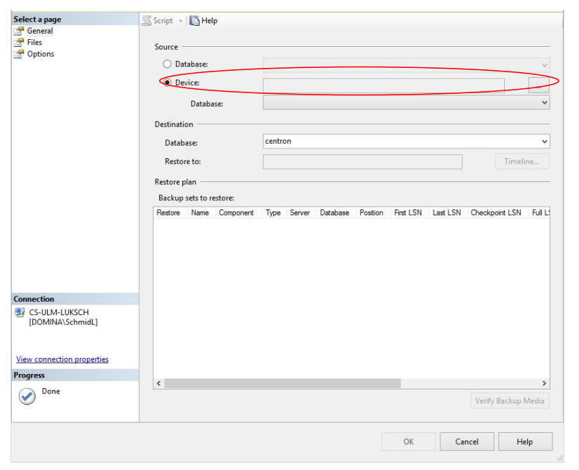 6. Restore the Centron backup from SQL Server 2008/2012 to SQL Server 2014 using the Restore option