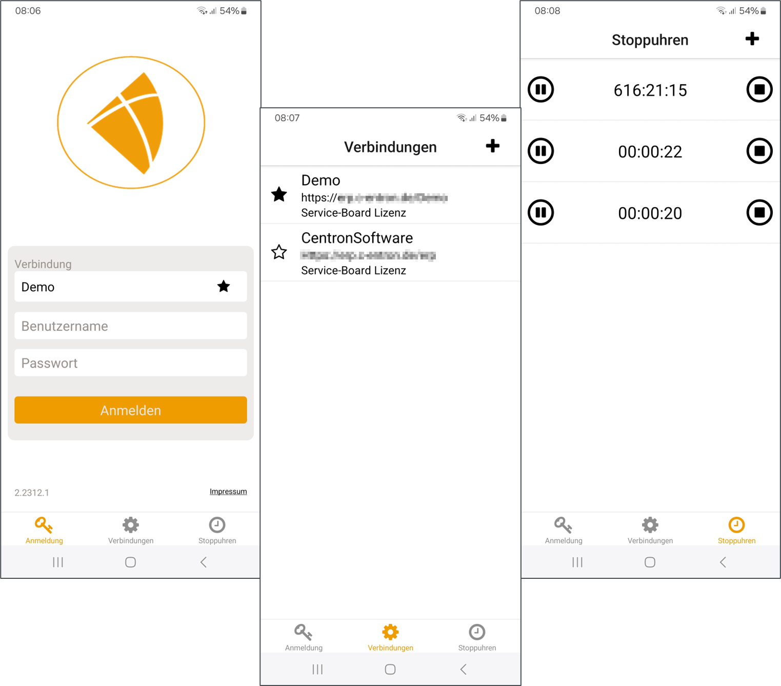 After launching the app, the login screen appears first, displaying the version number. All saved connections are listed in the "Connections" section. Here you can add further connections by clicking on the plus sign. On the right-hand side, under the "Stopwatches" section, you can view existing "offline" stopwatches.