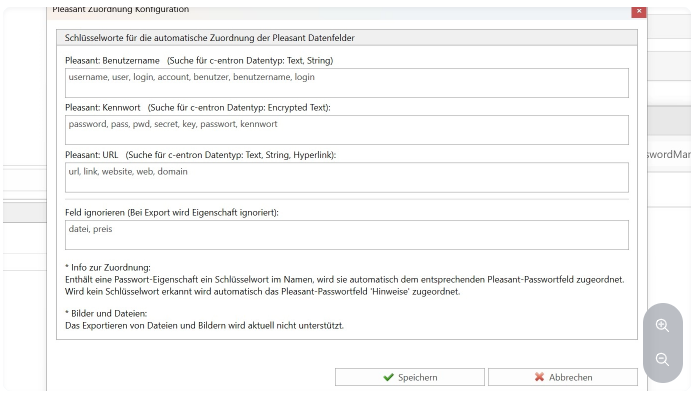 Click on "Config" to check the mapping between the c-entron Password Manager and the Pleasant Password Manager.